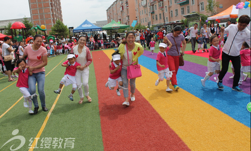 目标: 学习两人相互配合用三条腿跑步,增进亲子情感的交流。
